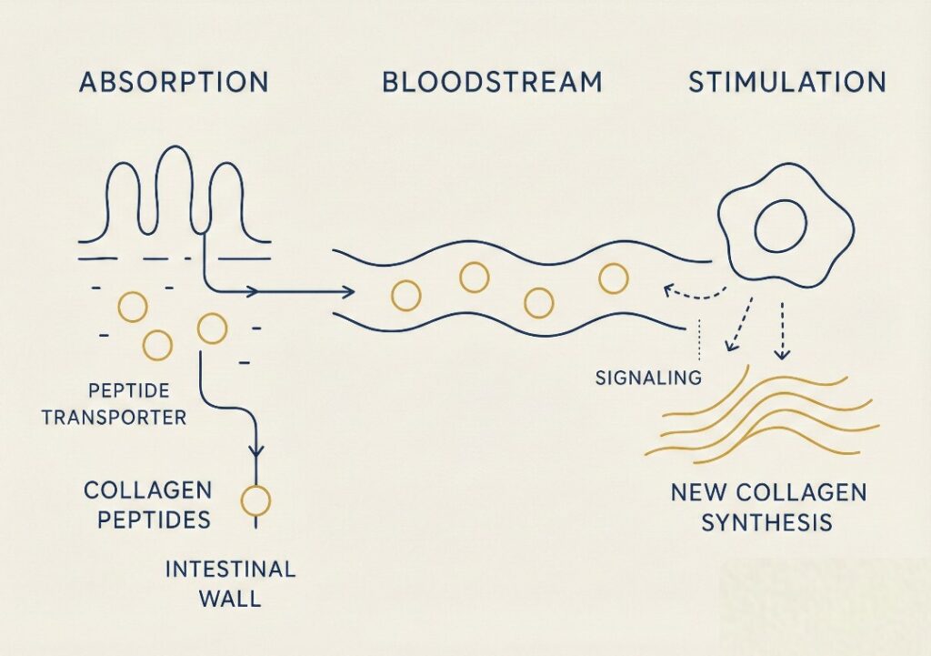 Inside these cells, many peptides are further hydrolysed (broken down by enzymes) into amino acids before entering the bloodstream. However, some sequences — depending on their stability and structure — remain intact and circulate through the body. These are the bioactive peptides.