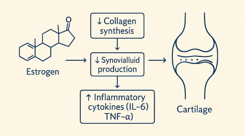 Estrogen plays a pivotal role in maintaining joint and cartilage health. Its decline during menopause leads to increased inflammation, diminished collagen synthesis, and reduced lubrication in joints. These factors contribute to joint pain and stiffness in the joints.