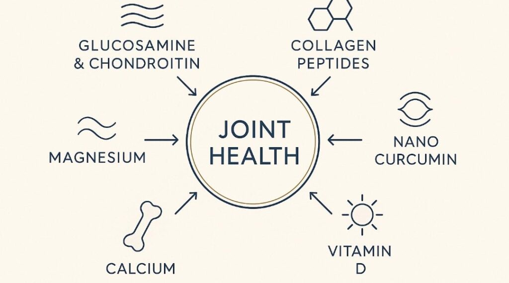 There’s no one-size-fits-all answer. However, hydrolysed collagen, curcumin (especially nano-formulated), magnesium, and vitamin D are often recommended together for a holistic anti-inflammatory and joint-supportive effect.